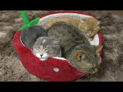 ベットの中に母猫と子猫がぎゅうぎゅう詰めで寝ています。家族仲良くひっつきもっつきで寝ているさまがとても可愛らしいです。平和な世界ですねぇ。